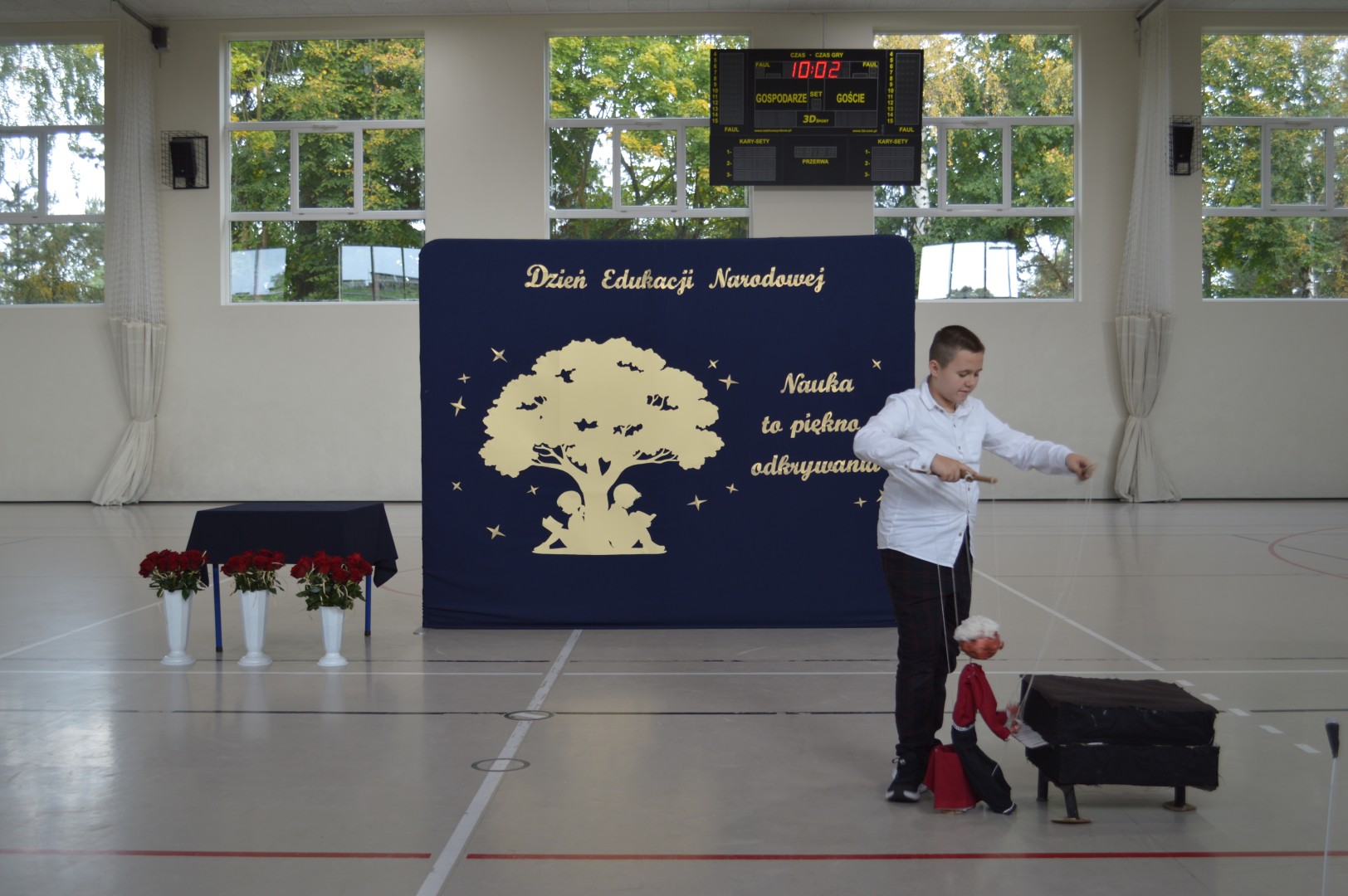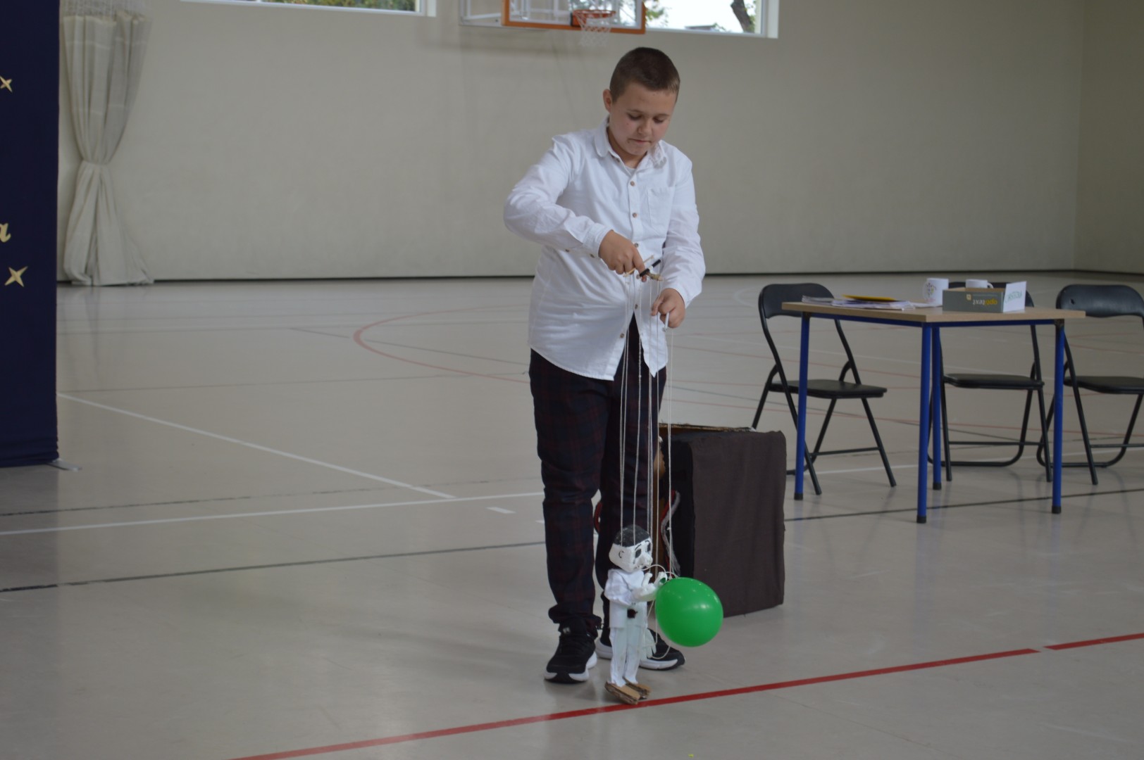 Program artystyczny rozpoczął się od występu ucznia klasy 7a – Andriia Vyhovskiego, którego pasją są marionetki. Zatem przywitał wszystkich zgromadzonych piosenką z tańczącą marionetką w roli rockmana.
