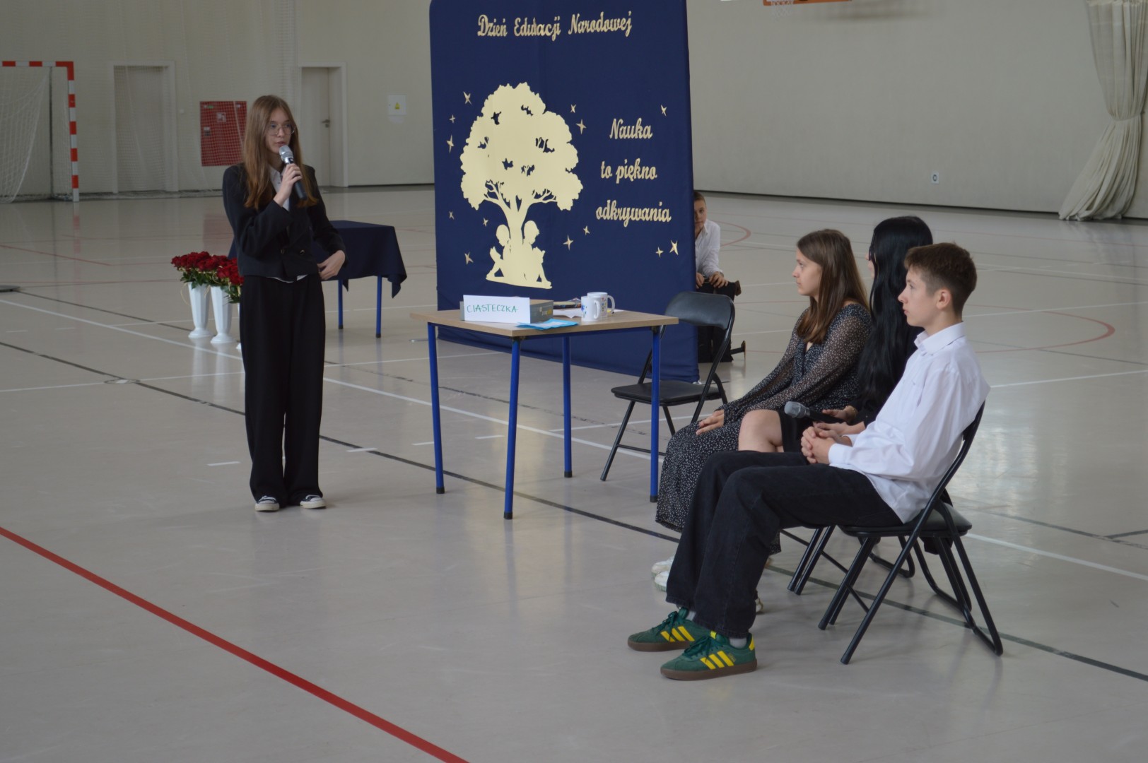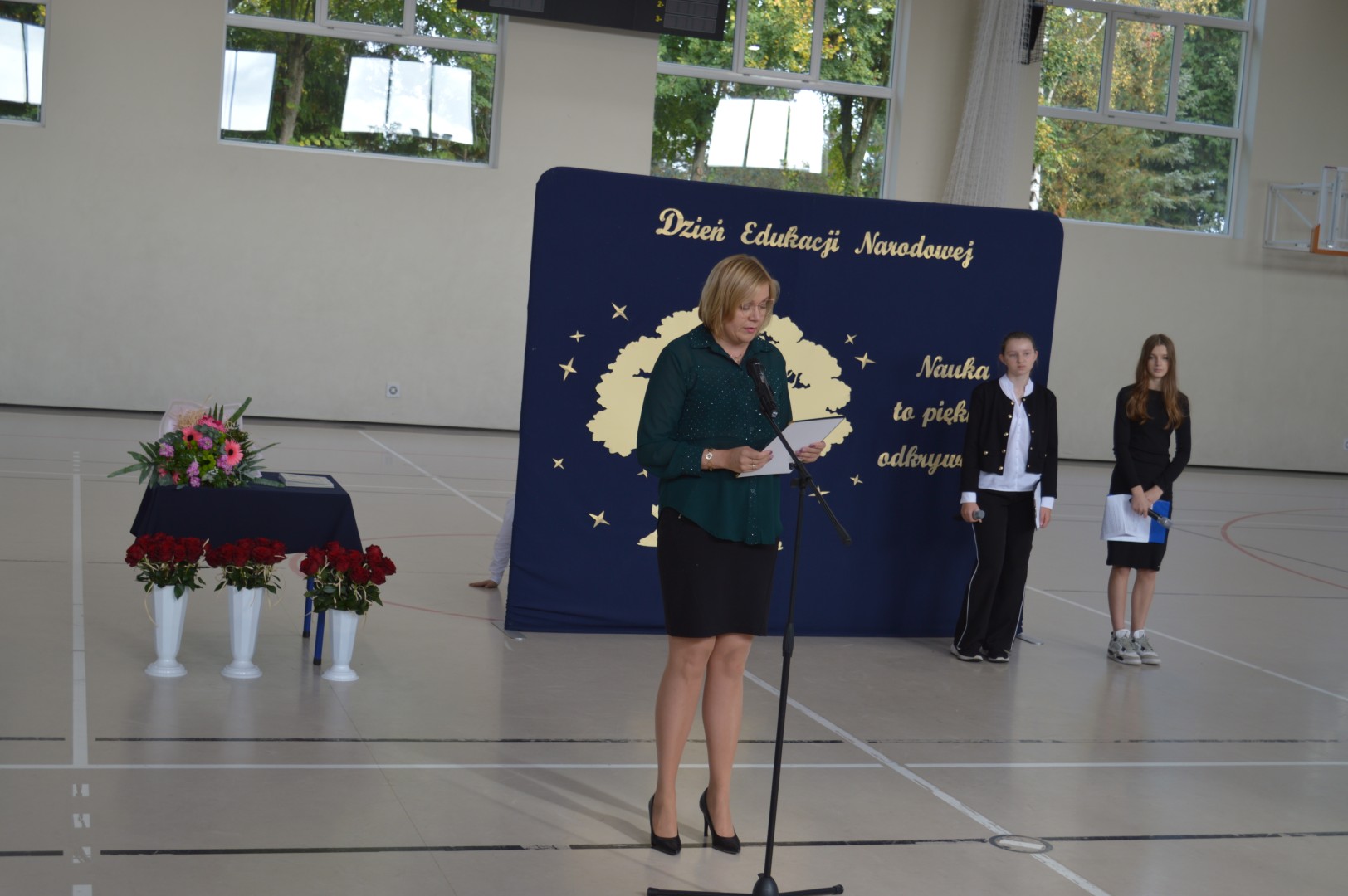 Dyrektor szkoły – Pani Lucyna Błaszak przywitała wszystkich zgromadzonych, składając serdeczne życzenia z okazji Dnia Edukacji Narodowej. Równie piękne życzenia na ręce Pani dyrektor przekazali zaproszeni goście. Nasi uczniowie również w tym dniu pamiętali o nauczycielach i wszystkich pracownikach szkoły.